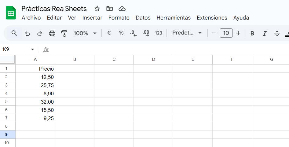 Introduce algunos precios en la columna A (a partir de A2). Por ejemplo:A2: 100