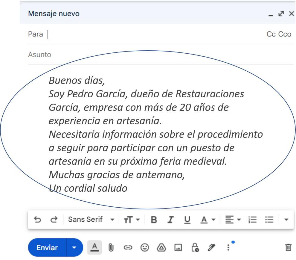 Pedro ha comenzado a escribir un correo al ayuntamiento para conocer cuándo se celebra la feria medieval anual y para saber qué tiene que hacer para poder participar con su propio puesto de artesanía.