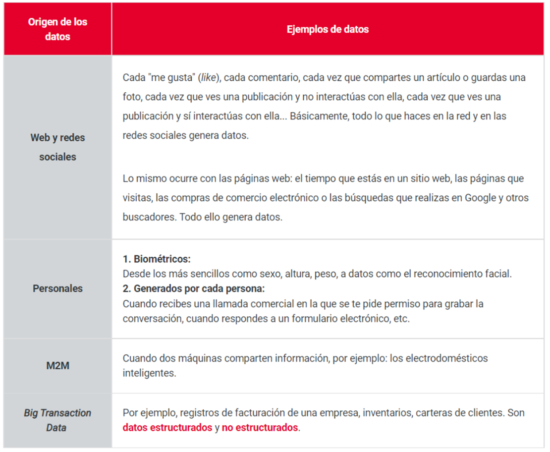 Además de los datos internos propios de la empresa, también se usan datos externos como la web, redes sociales, interacciones con la clientela o incluso datos procedentes de procesos automatizados que realizan máquinas en algunas compañías.