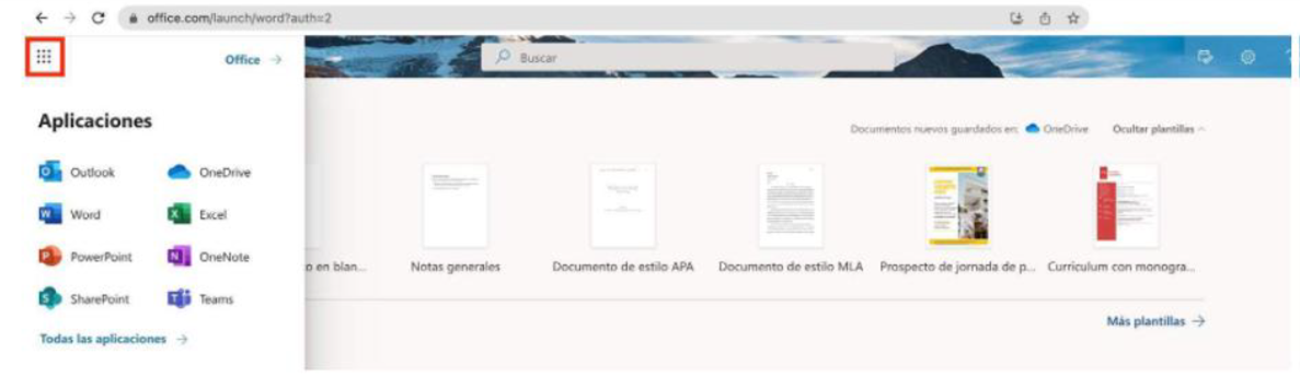 Si te has dado de alta en Microsoft, verás que en la esquina superior izquierda tienes un cuadrado de 9 puntos. Al pulsar en ellos, se extiende el menú de los programas. Son los programas de Microsoft Office 365 y, entre ellos, se encuentra Word.