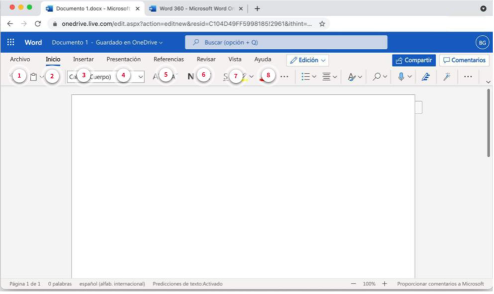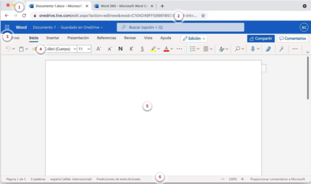 Una vez abierto el documento, encontrarás una serie de barras de menú. Pulsa sobre los números de la siguiente imagen y descubre cómo se organiza el lienzo de trabajo en Word.