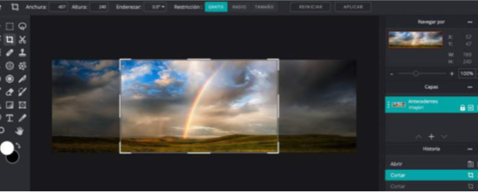 En la parte inferior de la imagen veremos la resolución de esta: 789 x 240 p. Esta es una resolución que permitirá hacer algunos ajustes sin perder calidad. Por ejemplo, recortarla desde el menú Imagen en el caso del programa PIXLR (versión 1.1.1.0 para iOS):