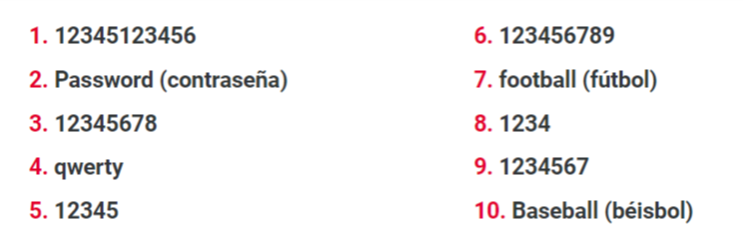 Has visto cuáles son las contraseñas más comunes y que son una puerta abierta para los ciberdelincuentes. Observa el siguiente ranking de las peores contraseñas que puedes utilizar: