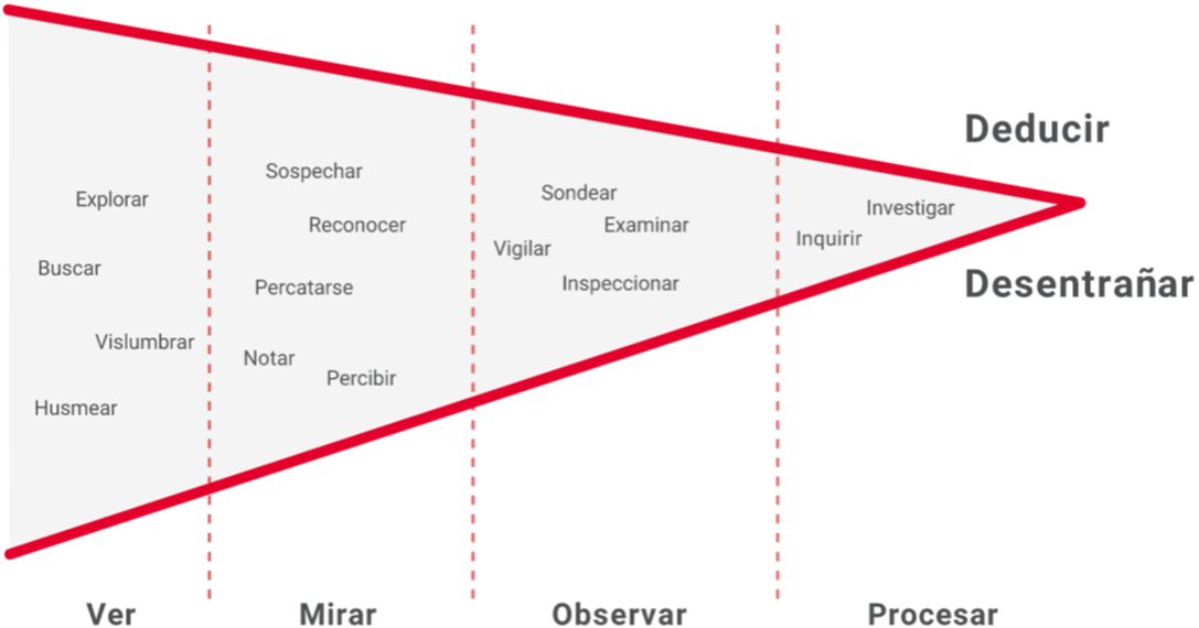 El proceso de comprender empieza con una mirada abierta. La persona creativa identifica las señales, las pone en contexto, encuentra lo novedoso. Así comienza cualquier análisis. Después, y a medida que avanza, comienza a ser capaz de reconocer, inspeccionar, inquirir...
