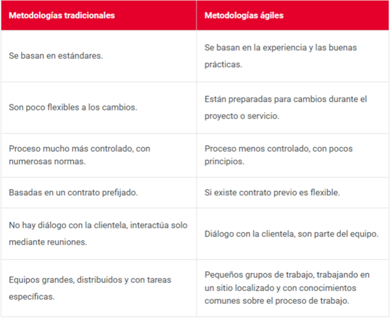 A continuación, se enumeran las características que definen las metodologías ágiles comparándolas con las características principales de las metodologías tradicionales: